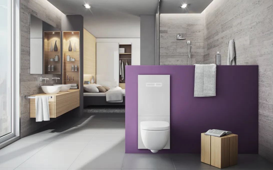 Badezimmer mit wandhängendem WC an lila Wand, links eine Glasdusche, modernes und offenes Design.