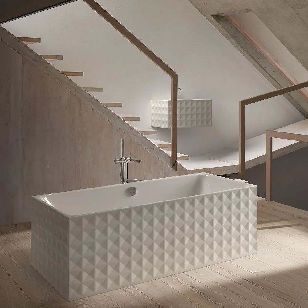 Wer es etwas ausgefallener mag, kann sich für die freistehende BetteLoft Ornament entscheiden. Während der Innenkörper identisch mit dem der BetteLoft ist, sorgt die feste Verkleidung mit einem sechsreihigen Ornamentmuster für die Extraportion Luxus im Badezimmer. Durch die facettenreiche Ornamentik entsteht ein wechselvolles Spiel von Licht und Schatten. Das verleiht dem Badezimmer einen lebendigen Charme.