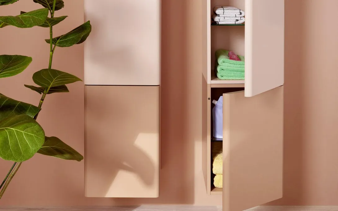 b:me von burgbad verfügt über ein breites Sortiment an wandhängenden Einzelmöbeln: niedrige, halbhohe und hohe Schränke in 35 cm Tiefe und Breite sowie 52 cm, 116 cm und 168 cm Höhe. Alle Schränke sind mit Glaseinlegeböden ausgestattet. Die niedrigen und halbhohen Schränke können zu Hochschränken kombiniert werden, je nach Wunsch zweifarbig. Die grifflosen Rundfronten lassen sich per Tip-on- und Soft-close-Technik öffnen und schließen.