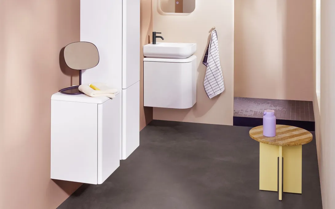 Das Badezimmer wird zum Wohnraum: Die Kollektion b:me von burgbad verbindet einen progressiven Look mit einer wohnlichen Ausstrahlung. Licht- und Schattenspiele von Sanddünen standen dabei Pate für die weiche Formsprache des gesamten Ensembles. Die Design-Serie b:me ist aufgrund der großen Farbpalette individualisierbar und eignet sich auch als Option für Kleinbäder.