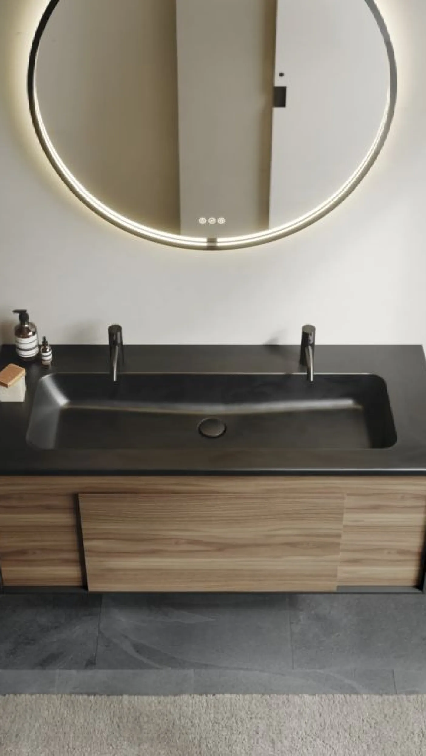 Ob Gäste-WC oder Familienbad – Moto bietet Waschtische in Breiten zwischen etwa 810 bis 1410 mm in Mineralguss oder Keramik. Auch Gäste-Badversionen mit kleineren Maßen sind verfügbar.