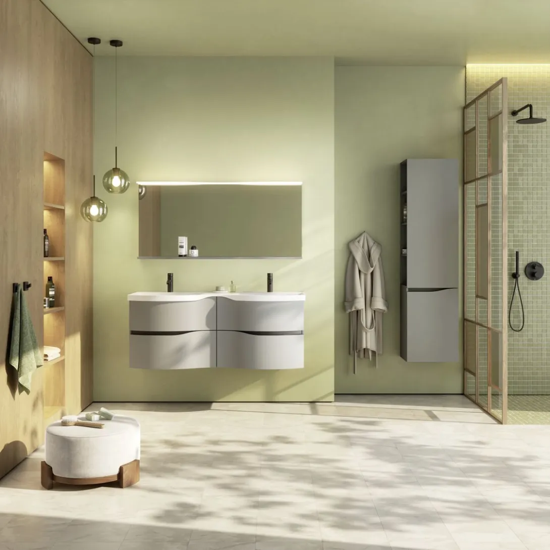 Sinea 3.0 bietet passende Stauraummöbel für kleine und große Bäder. Hochschränke und halbhohe Varianten schaffen Platz für Handtücher, Pflegeprodukte und Zubehör. Die Formensprache bleibt dabei harmonisch zur Waschtischlösung.