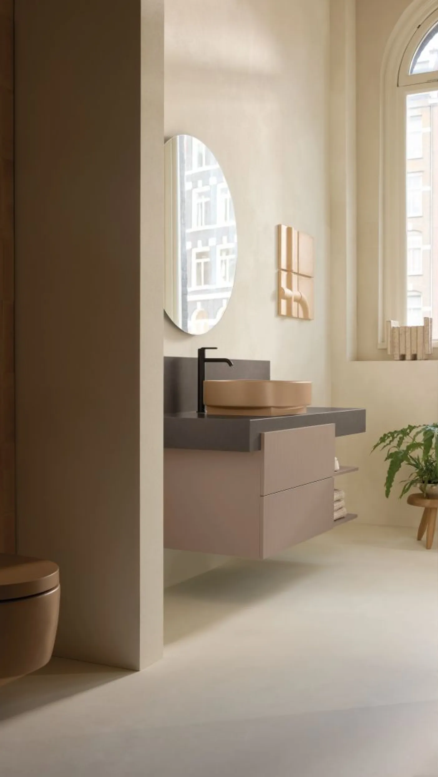 Ockerfarbenes Badezimmer mit einem Premium-Aufsatzwaschbecken der Serie Balcoon von Duravit vor einer großen Tuer- und Fensterfront mit gruenen Pflanzen.