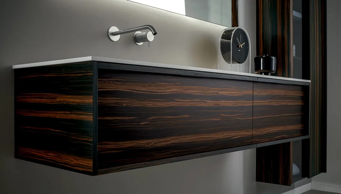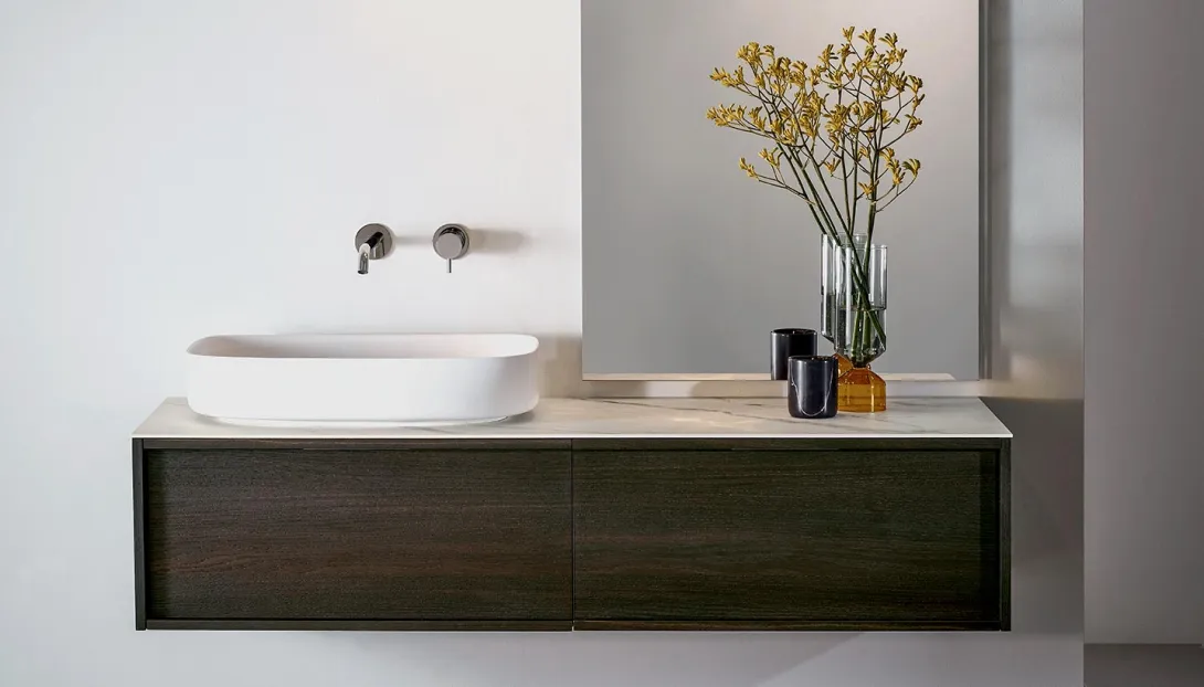 Detailansicht eines schwebenden Holzwaschtischs mit dunkler Platte und Aufsatzbecken von Stocco.