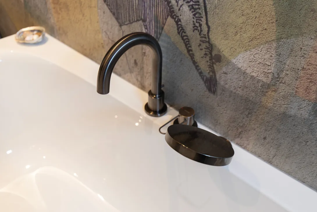 Fein brünierte Armaturen setzen elegante Akzente, während die warmen Holzoberflächen der Badmöbel für ein spannendes Wechselspiel zwischen Natürlichkeit und Eleganz sorgen.