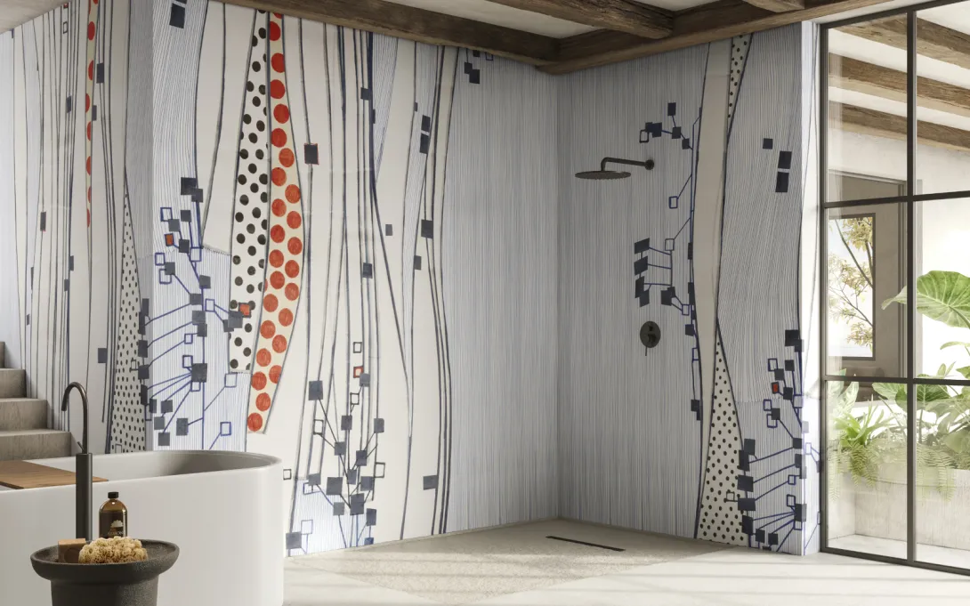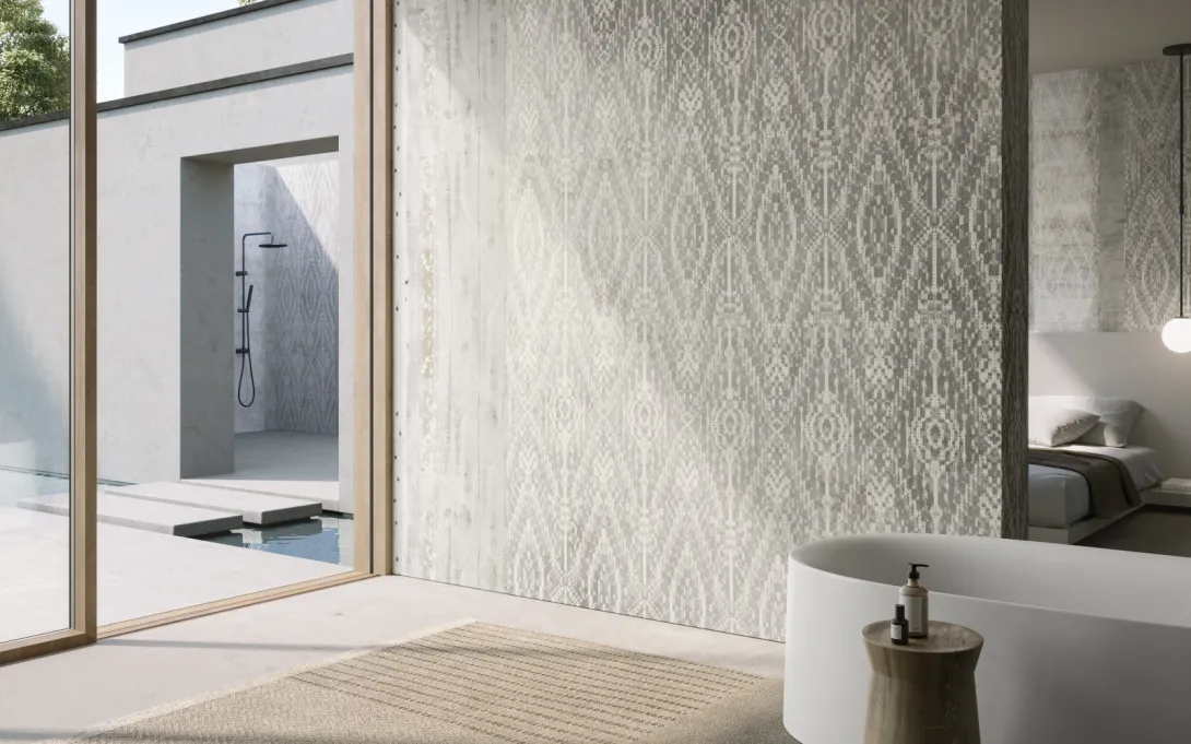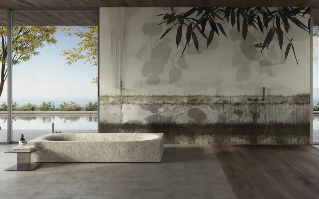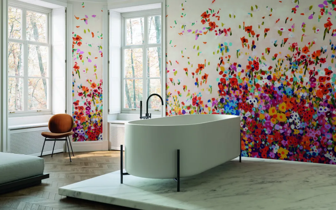 Ein modernes Badezimmer mit einer freistehenden, ovalen Badewanne und einer kunstvoll gestalteten Wand im Hintergrund.